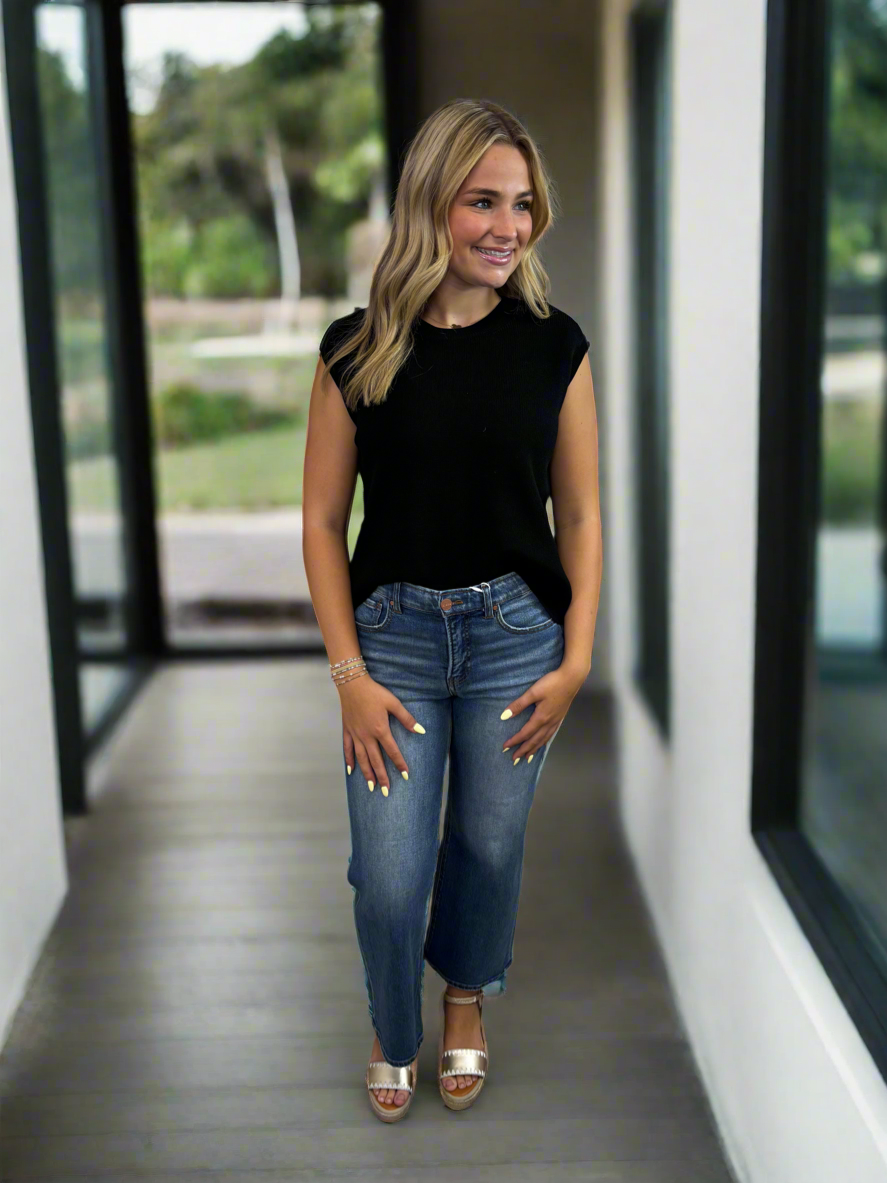 This elegant black knit top features a refined crew neckline with extended shoulder caps, adding a subtle architectural detail. The back showcases a tasteful keyhole and center split, creating an open, airy effect. Crafted from ribbed textured fabric with a soft drape, it offers both comfort and style. Perfect for layering or wearing on its own, this versatile piece elevates any wardrobe with understated sophistication.