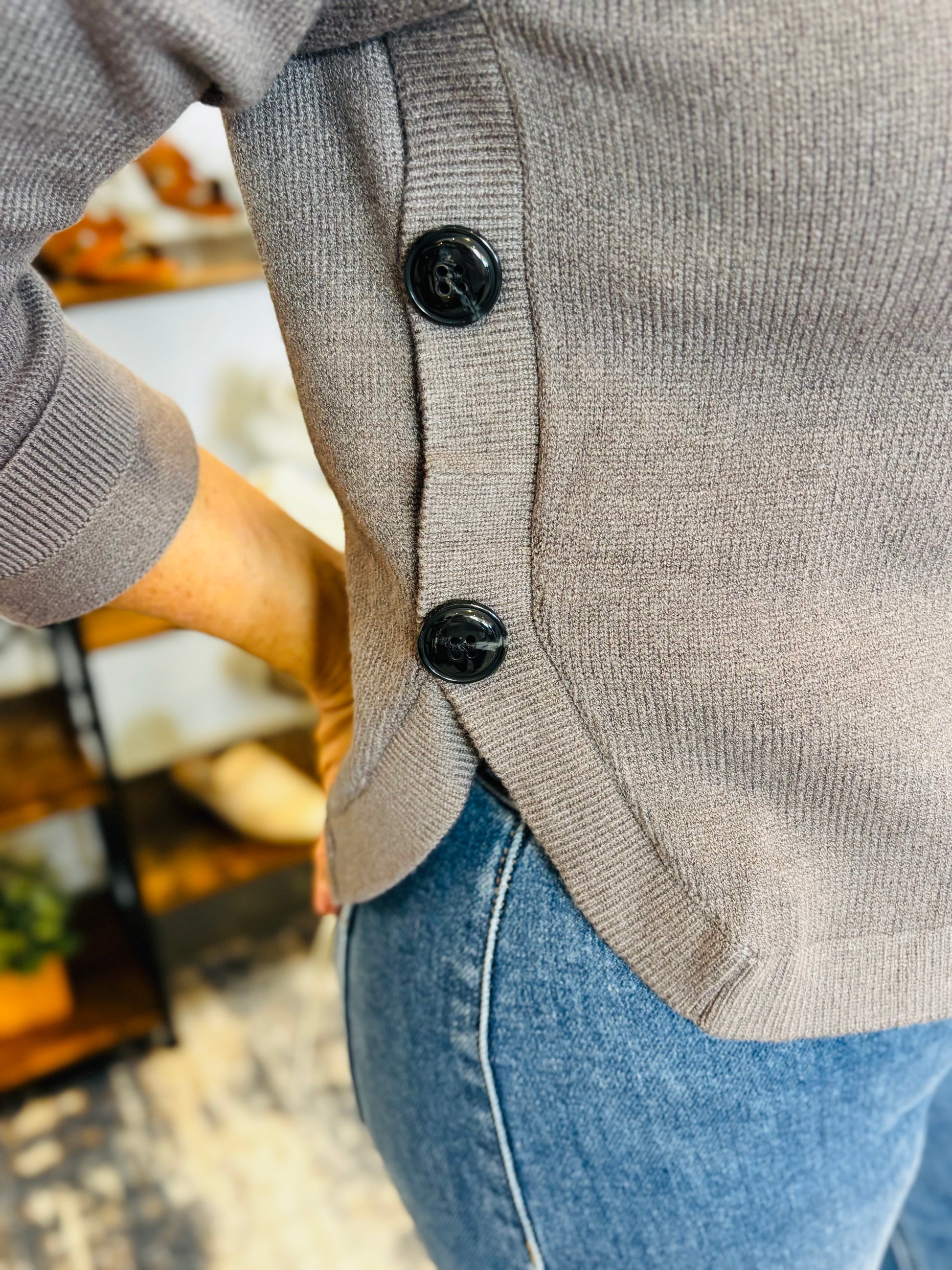 Wrap yourself in comfort and style with our soft knit charcoal sweater. The ultimate wardrobe essential for cozy days and casual-chic look. Crafted from ultra-soft knit fabric, this long sleeve sweater offers the perfect balance of warmth an breathability. Featuring a classic crew neckline and ribbed hem , this sweater flatters with a clean, timeless silhouette. The non-functional button accents on both sides of the hem add a subtle , stylish twist, giving it just the right amount of modern charm. The light grey color pairs effortlessly with jeans, leggings, or skirts for endless outfit options.