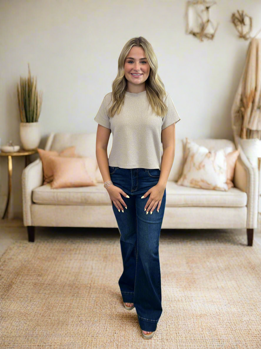 This khaki waffle short sleeve top combines comfort and style effortlessly. Its soft, stretchy fabric moves with you, making it perfect for all-day wear. The long crop cut and playful round neckline add a trendy touch, while the khaki shade gives it versatile charm. Ideal for casual days when you want to feel relaxed yet put together.