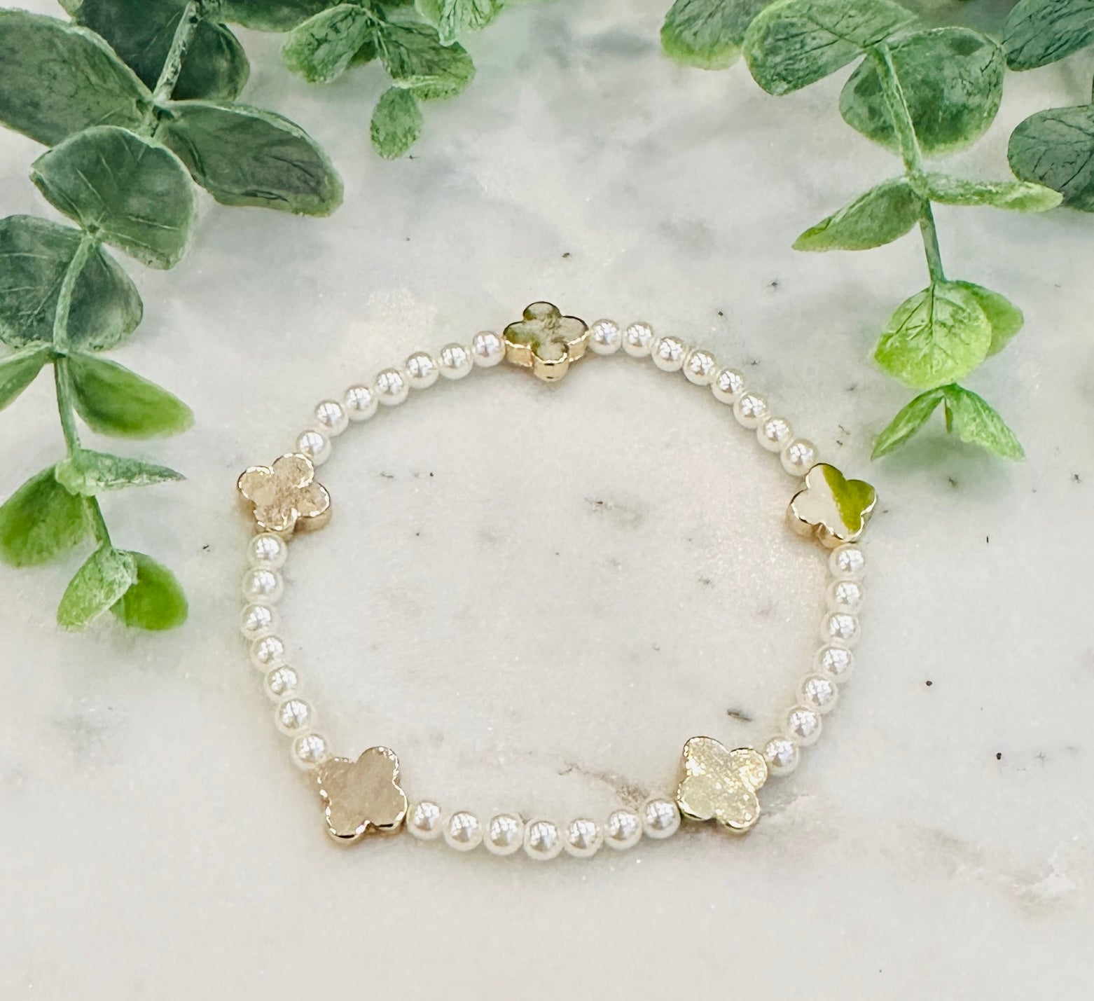 Mini Pearl Stretch Bracelet W/ Gold Clover